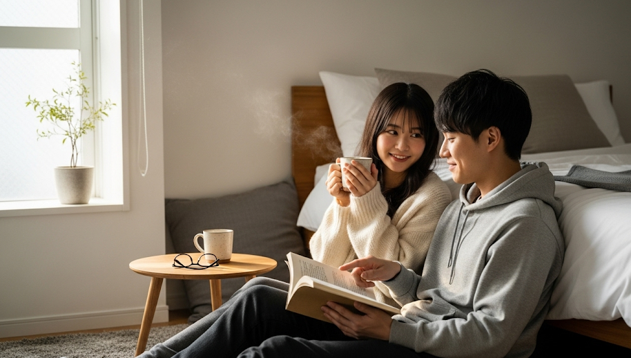こうした何気ない時間が、部屋の空気を二人のものに変え、心の緊張を解きほぐしてくれます。